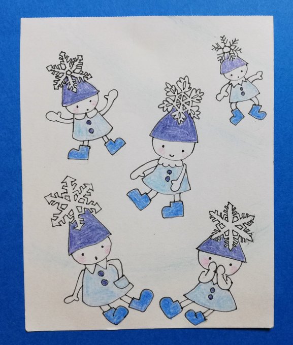 今日のお絵描き 雪ん子❄️ 福音会に駅まで行きました 100均で自分の買い物をしてから迎えに来てくれた息子と食料品の買い物でスーパーの中を歩き回りとても疲れました😓 明日の天気予報は雪🌨️ 空からくるかもしれない雪ん子たちの絵を描きました✍️ こんな可愛い雪ん子たちなら雪かきも楽しいのになぁ🥰