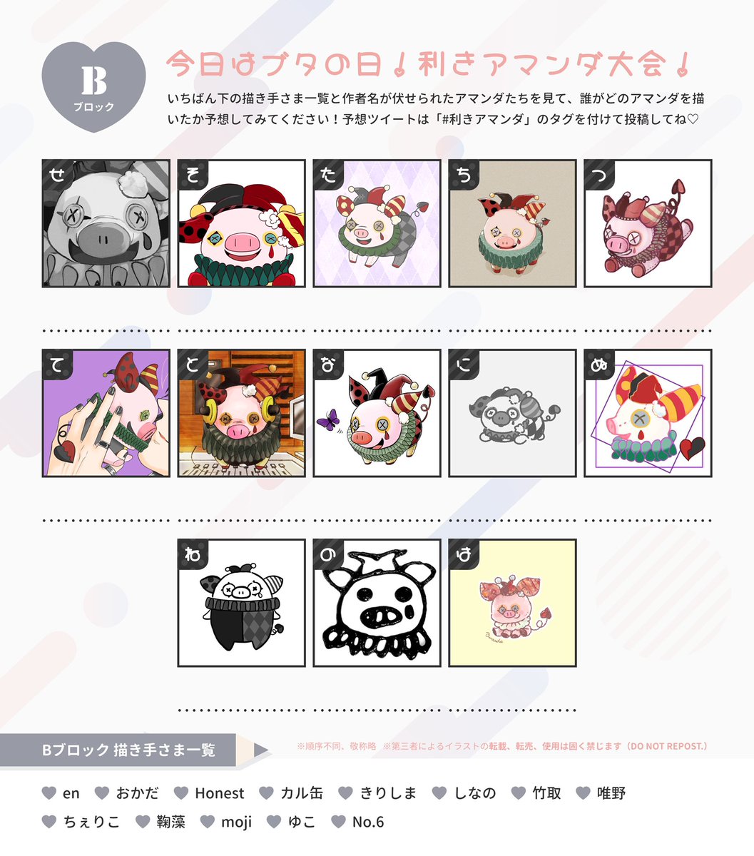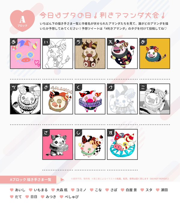 3/1はブタの日🐷なんだって!ということで、#利きアマンダ 大会開催〜🤗💕 A・Bブロックそれぞれの画像のいちばんにある"描き手さま一覧"と、作者名が伏せられたアマンダたちを見て誰がどのアマンダを描いたか予想してみてください🕵️♀️ #利きアマンダ のタグを辿るとヒントがあるかも💡正解発表は3/12!