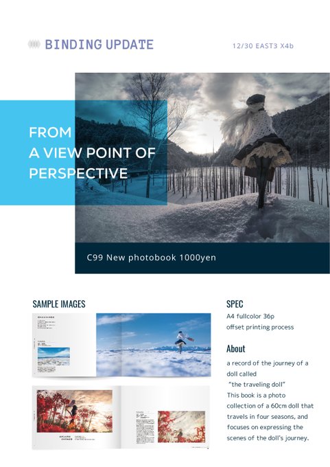 あなたのサークル「BindingUpdate」は、コミックマーケット100で「土曜日西地区 "え " 09b」に配置されました!コミケWebカタログにてスペース配置場所公開中です webcatalog.circle.ms/Circle/Map/162… #C100WebCatalog TLに流していない山ほどある未公開画像で旅するドールの写真集作り上げます