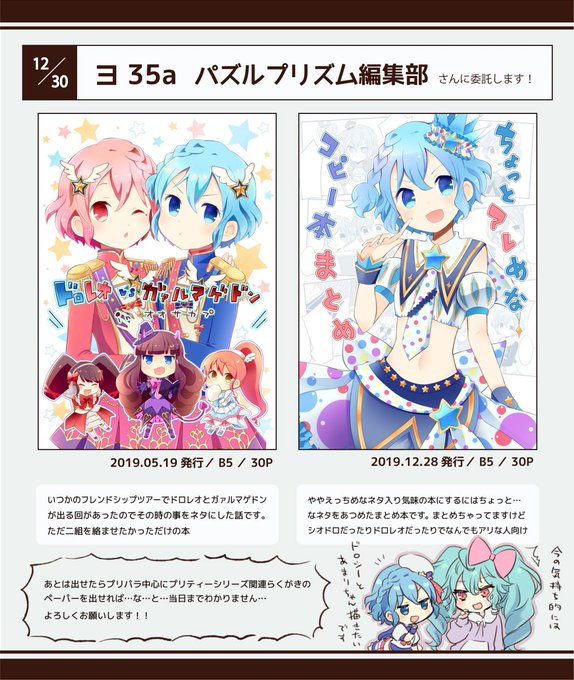 すごく突然ですが明日30日のコミケ、友達のスペースに既刊を置かせてもらうことになりました! 東ヨ35a です。既刊以外はプリパラ関連とかのらくがきを詰めたペーパーができれば… サンプルはURLからお願いします! コピー本まとめ【pixiv.net/artworks/78505…】 ドロレオ本【pixiv.net/artworks/76055…】