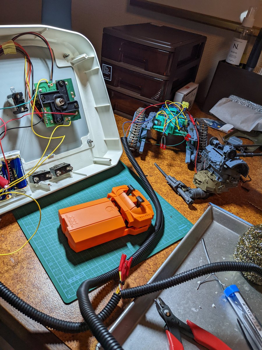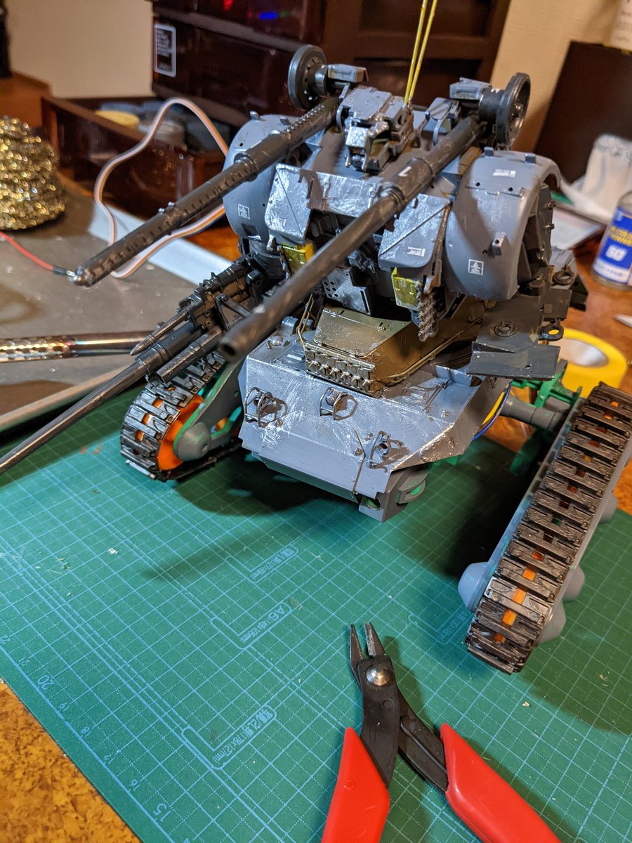 タミヤ製ガンタンク、コントローラー変更中。配線完了し、動作確認OKでした。こんな時間になってしまった... #ガンプラ #ガンタンク #タミヤ