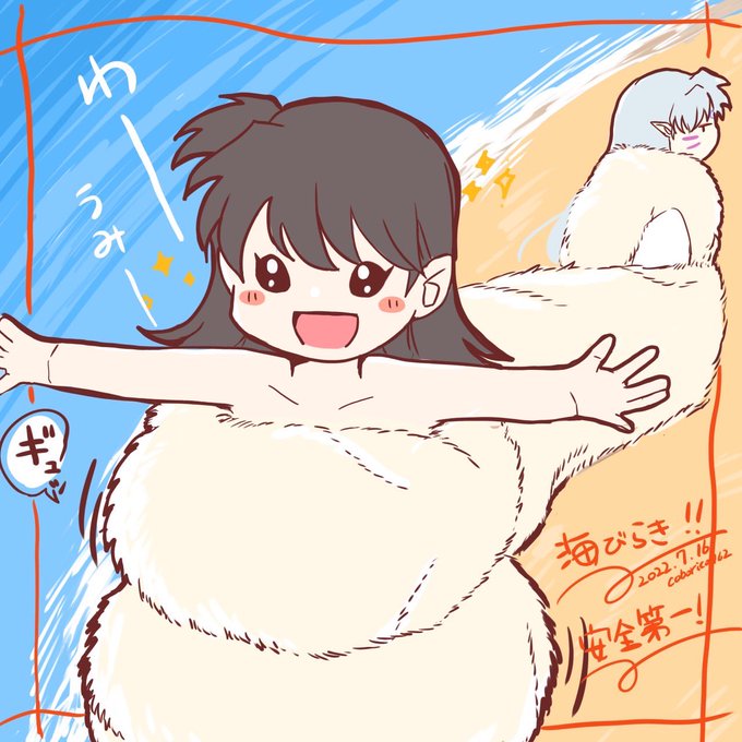 ワンドロ!海開き殺りんちゃん!! 海だーーーって着物脱ぎ捨ててすっぽんぽんで飛び込もうとするりんちゃんにすかさずもこもこ巻き付けて溺れたりしないようにする丸さま!モコモコ浮きそうだしね😉 水場で遊ぶときは注意しながら遊ぶのです! #殺りん版深夜の真剣60分お絵描き一発勝負