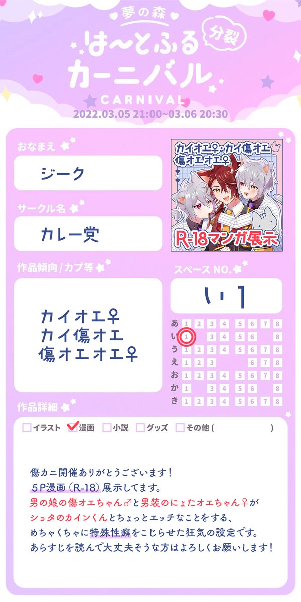 23 84 傷カニ【い1】です🍛男の娘の傷ちゃんと男装のにょたオエちゃんの双子がショタのカインとちょっとえっちなことになるおねショタのような5P漫画展示します!カイオエ・カイ傷オエ・傷オエオエ含む特殊性癖の塊ですがよろしければよろしくお願いします!🙇♀️ #傷カニ0306 #傷カニ0306_参加告知 22/03/04 12:02