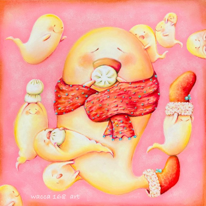 いただきまーす♫ 肉まんとおばけたち👻 #イラスト #絵描きさんとつながりたい #アナログイラスト #アート #食べ物イラスト #肉まん #オイルパステル #illustration #food #artwork #アート好きな人と繋がりたい #イラスト好きな人と繋がりたい