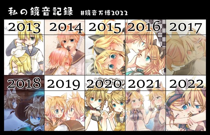 #鏡音万博2022 何年にもわたって描き続けていた鏡音といえば猫みねだったので。この中で一番古いのが9年前…。猫耳猫しっぽな鏡音可愛い!!