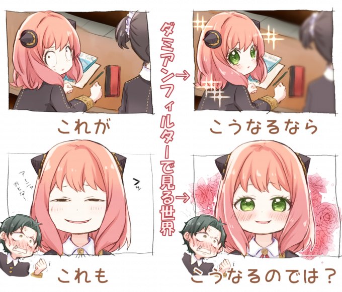 アニメ7話のダミアン視点でのアーニャへのフィルターのかかり具合が凄かったので…。普段から、ダミアンにはこんな風に見えてたりするよね…?