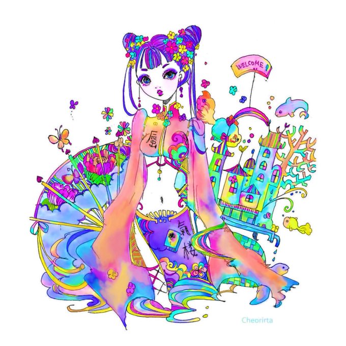 チェロリータさん( @Cherorita1 )の素敵な線画を塗らせて頂きました✨🌈世界観が可愛くてお気に入りです🥰♥️ #ぬりえ #イラスト #illustration #イラスト好きな人と繋がりたい