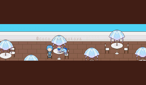 0 6 こちら、海辺のカフェっぽいマップチップの一部です! 歩行キャラクターの頭身もいい感じになってきました! #ドット絵 #プレミアムツクールデー 20/08/17 23:38