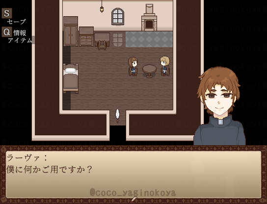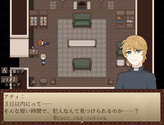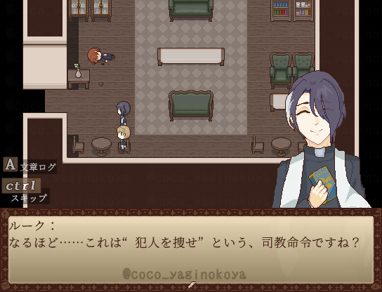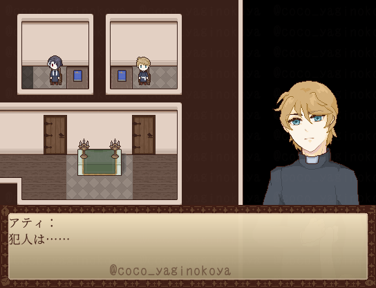 「止まり木を発つ駒鳥へ」 ミステリーホラー風の探索ADVゲームがもう少しで完成します。 事件の真相を追う『アティ』助祭の選択と結果まで、あともう少し。 #ドット絵 #スーパーゲ制デー
