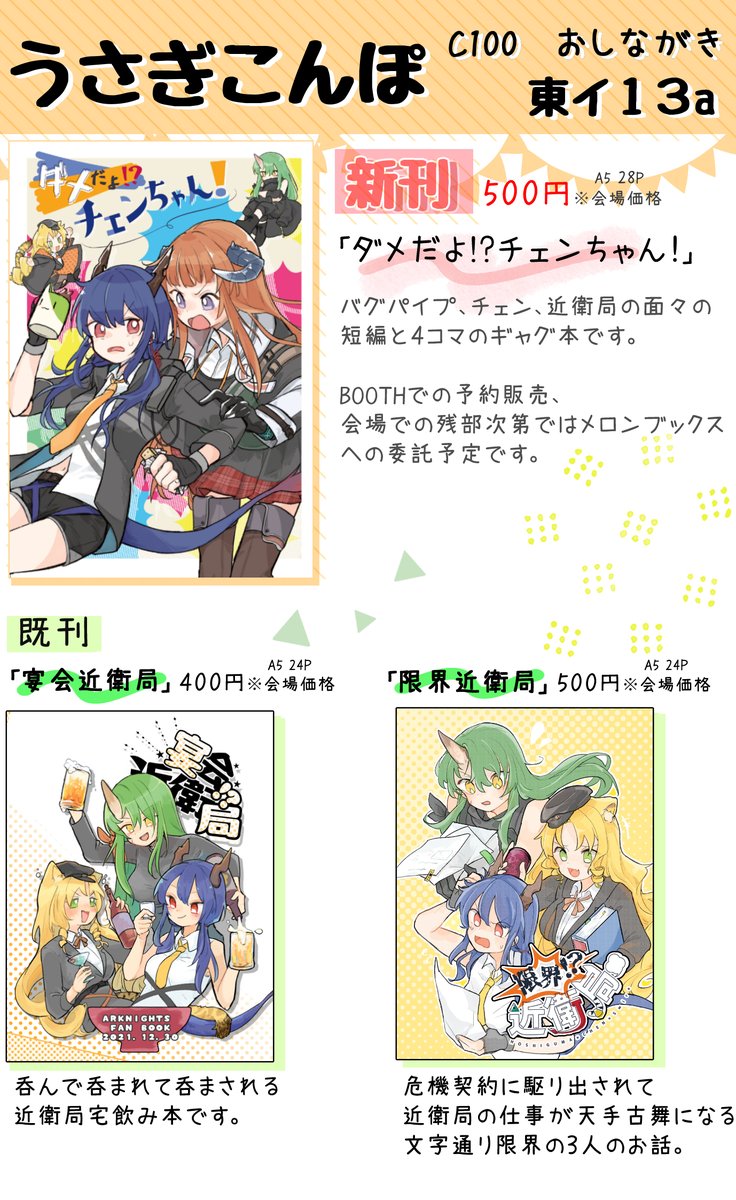【C100お品書き】 8月14日(日)「東イ13a うさぎこんぽ」 バグパイプとチェンと近衛局の短編集を配布します!※サンプルはツリーにて 他にも少部数ですが既刊を再販します。 予約はBOOTH⇒usakon.booth.pm 会場の残部次第では後日メロンブックスへ委託を予定しています。 #C100 #C100お品書き