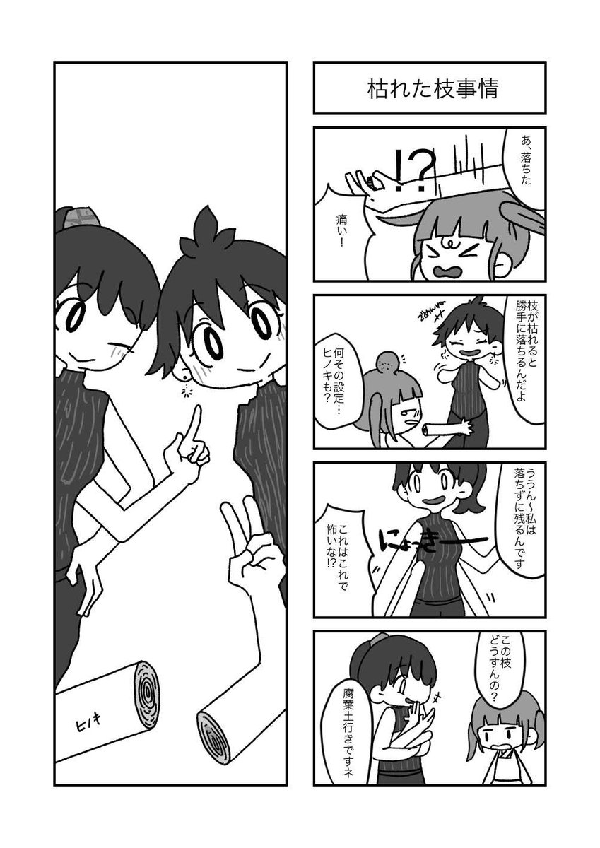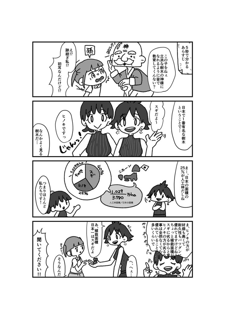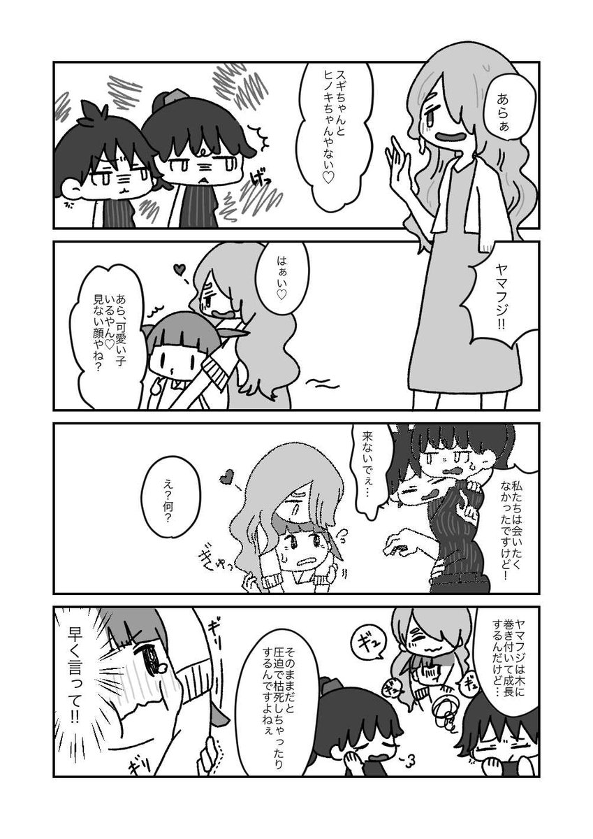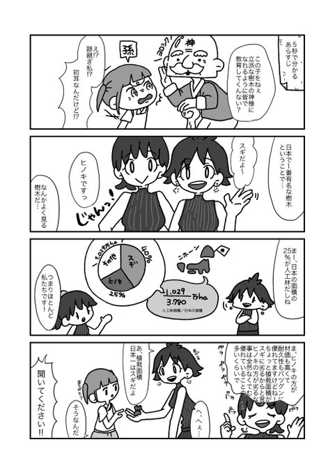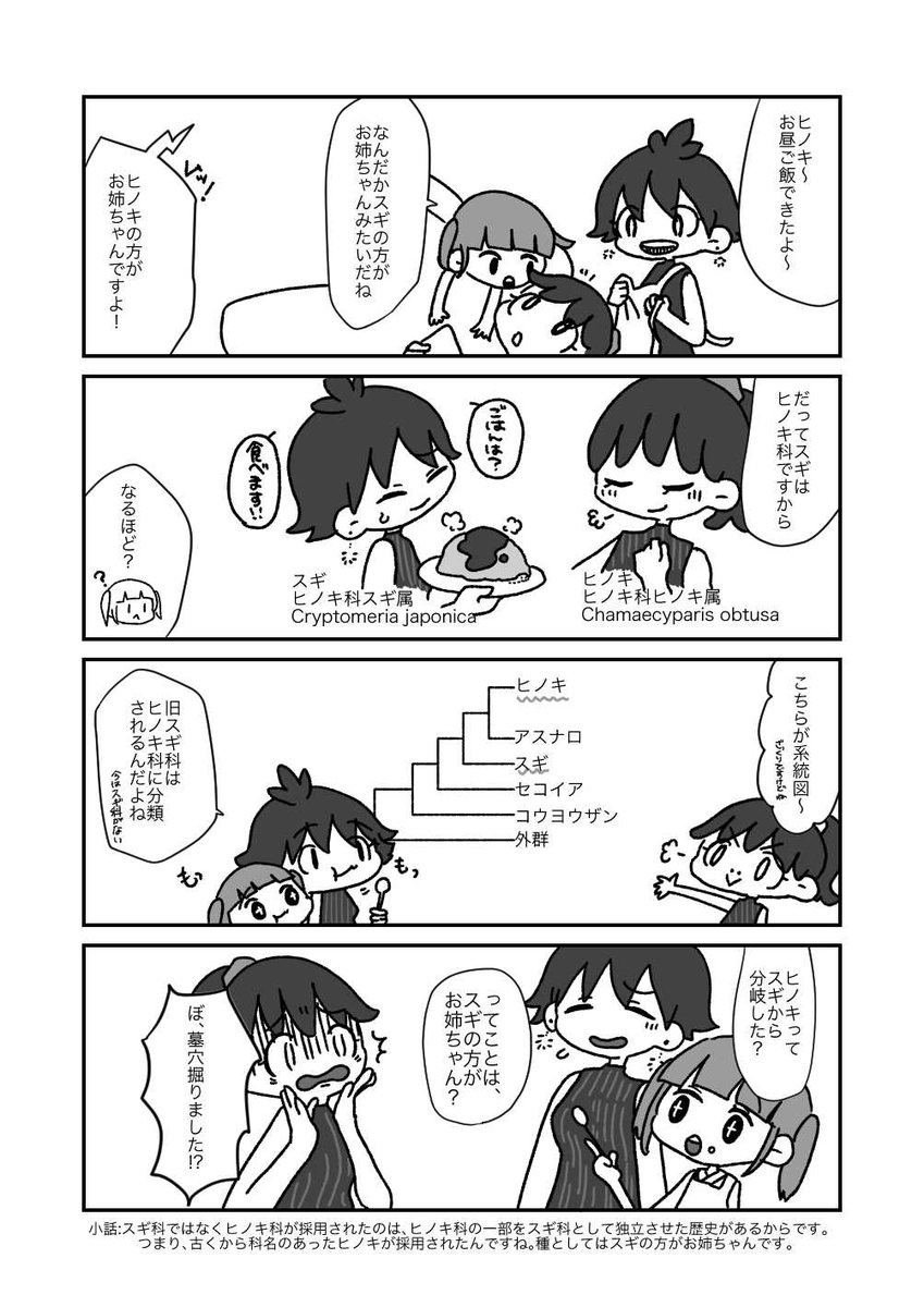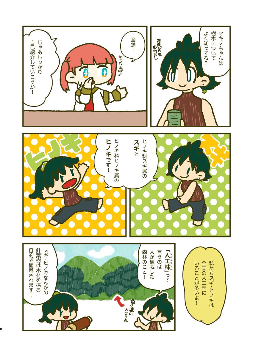 関西コミティア前なので、樹木れぽーとを再掲します!🌲「樹木れぽーと」は樹木の話を漫画でわかりやすく解説する感じのもので、樹木をいっぱい擬人化しています。人工林代表種、スギとヒノキの違いって何?と言う話が1巻です☺️(1/2) #樹木れぽーと #漫画がよめるハッシュタグ