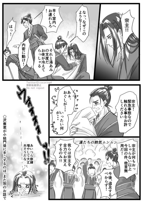 アニメ魔道祖師3期ネタバレ注意 江澄に少しでも救いがあったらと描きました あの若さで蓮花塢を復興させた江澄には、それを側で見ていた漢気あふれる門徒達がいると思います 兄上が来るまで門徒達のBIG LOVEに包まれていて #江澄を幸せにするのは私だ #MDZSS3 #MDZSS3FINALE