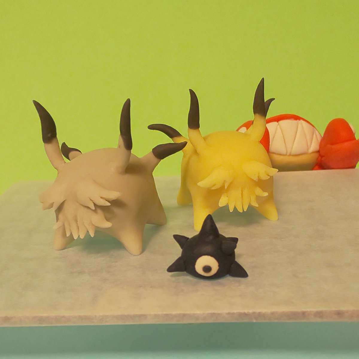 マグちゃん完走おめでとうございます。 無位の存在『忘却』のシュロ=シモー出来た 未だ名も知らぬ頃、小さいウミウシの一種がモチーフかと思って作ってたのが黄色い方「ピカー」とか言いそうな配色だが他意は無い。アイボリー色は色作り難しかった想定の色にならずです。 #破壊神マグちゃん混沌芸術祭