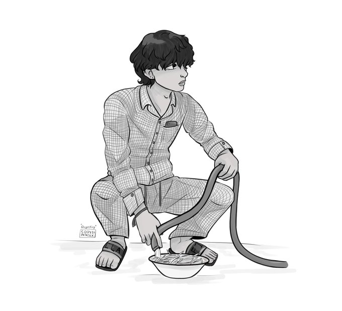 i was going to draw jin making ground sashimi for this, but then i remembered tae washing bean sprouts with literal hose water when there was a perfectly good sink inside inktober day 11: "disgusting" #inktober2020 #inktober #inktober2020day11 #btsinthesoop #TAEHYUNG @bts_bighit