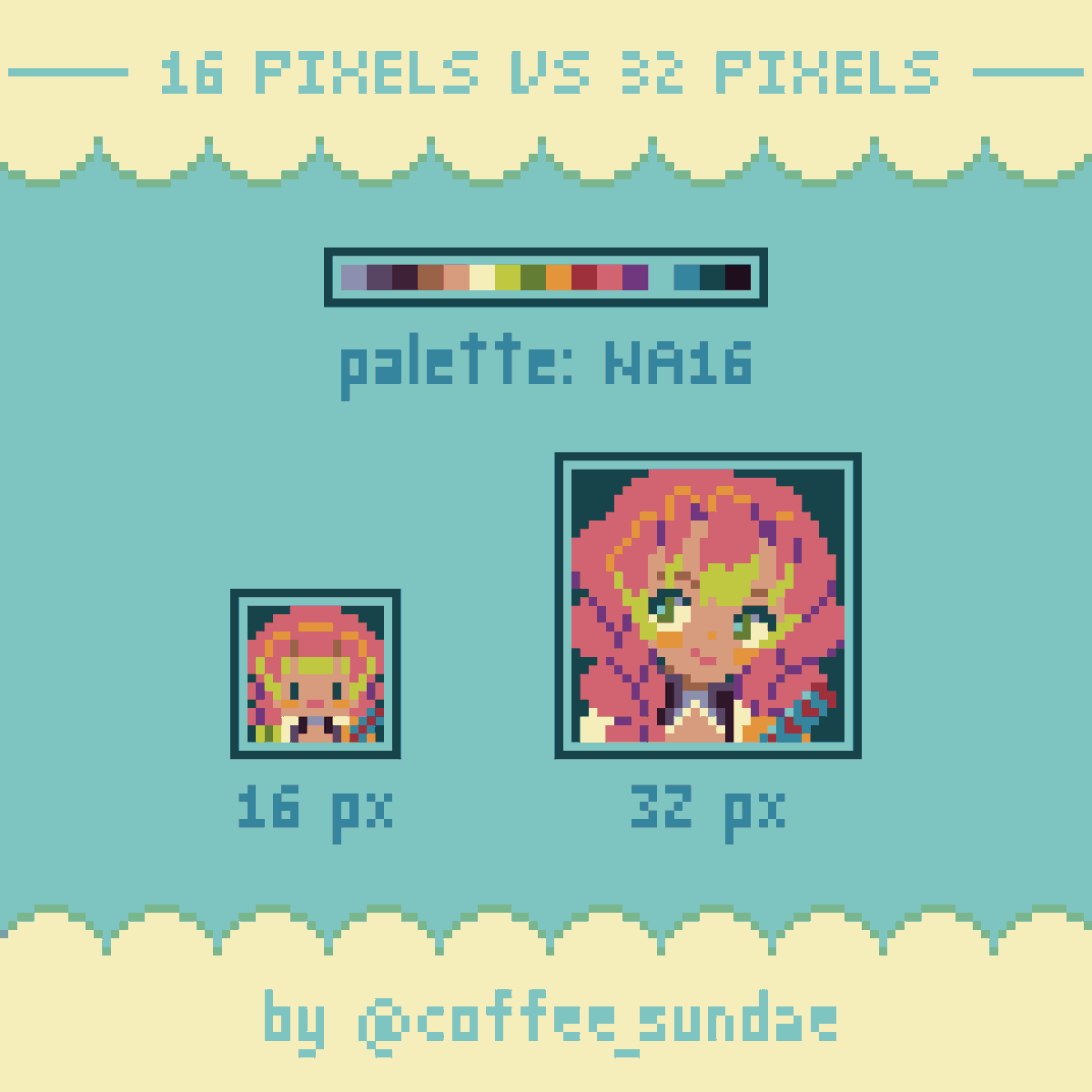 I made this portrait using only the "NA16" colors (find palette at Lospec), and in 2 canvas sizes: 16 versus 32 pixels! #pixelart #ドット絵 #aseprite #甘露寺蜜璃 #鬼滅の刃