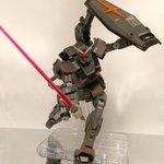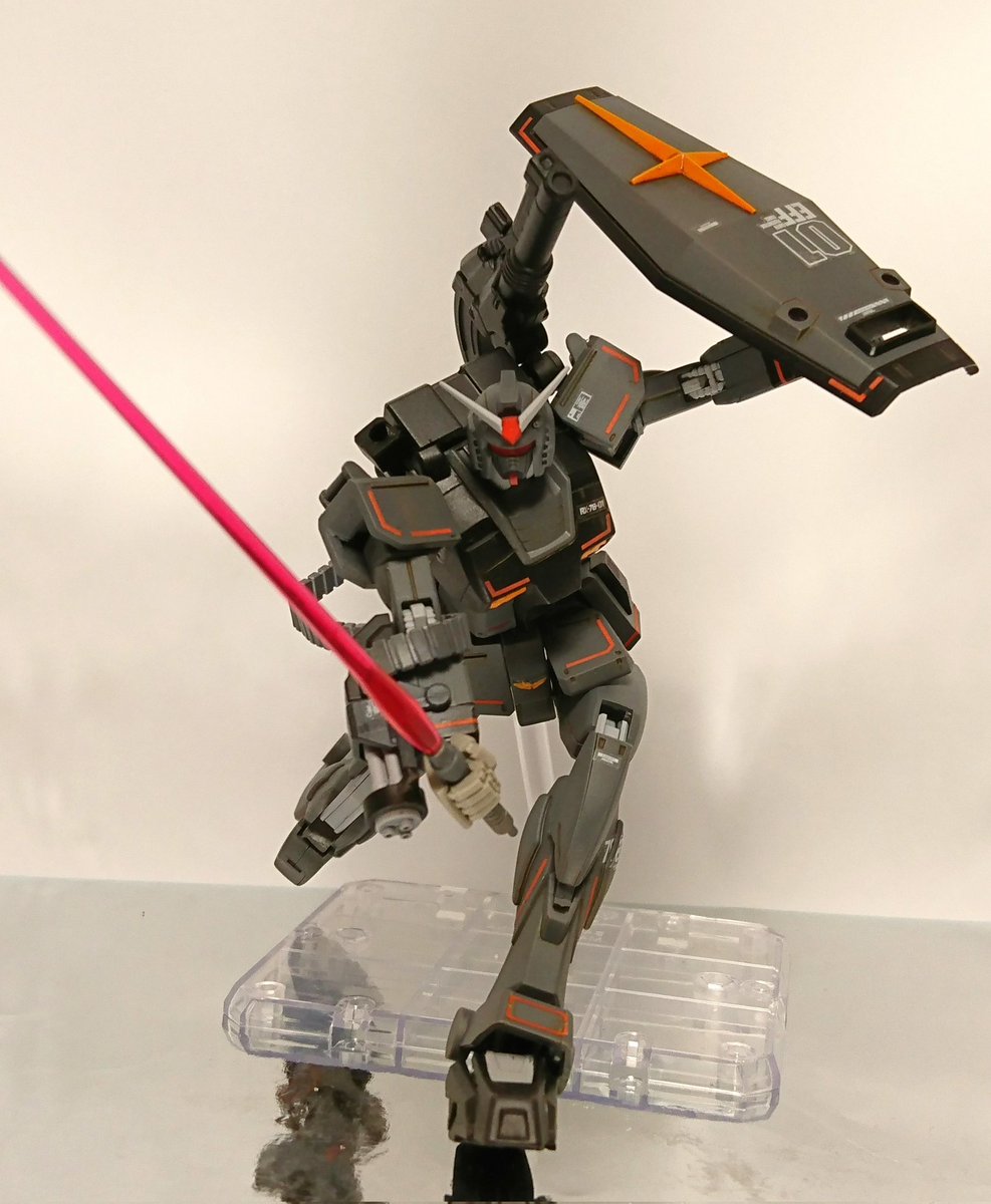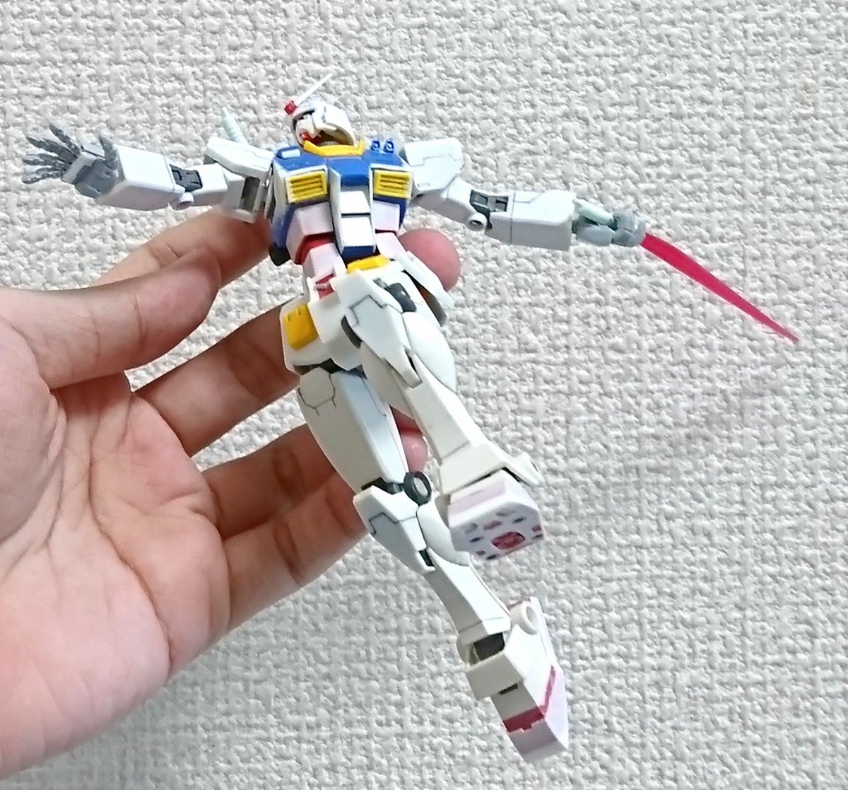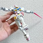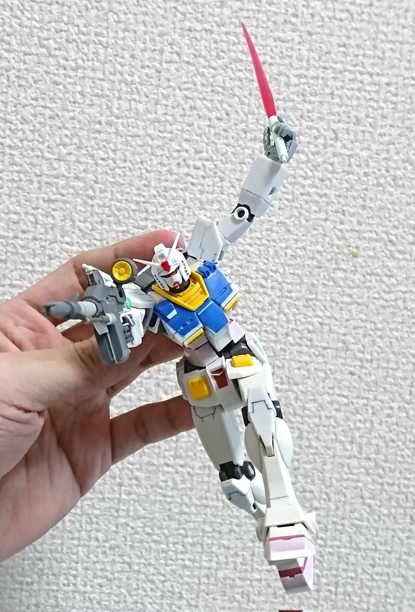 オリジンガンダム続き 以前、ビルダーズパーツの連邦ハンドで作った角度付きサーベル持ち手が気に入らなかったので、ジオンハンドで作り直しました ライフルも下部のボックスがギミックの都合上側面に張り出していたので、一旦切り離して合わせ目で幅詰めしました マウント用のピンは塞ぎました