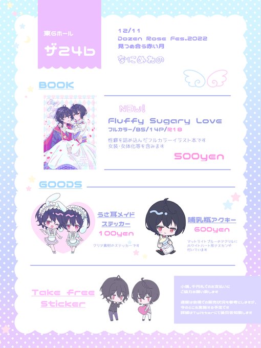 12/11のお品書きです!💜💙 無配は購入者でなくてもお持ち帰り頂けますので、お気軽にお越し下さい♪♪ イラスト本サンプル→pixiv.net/artworks/10339… グッズの見本はツリーにて🍼🍼