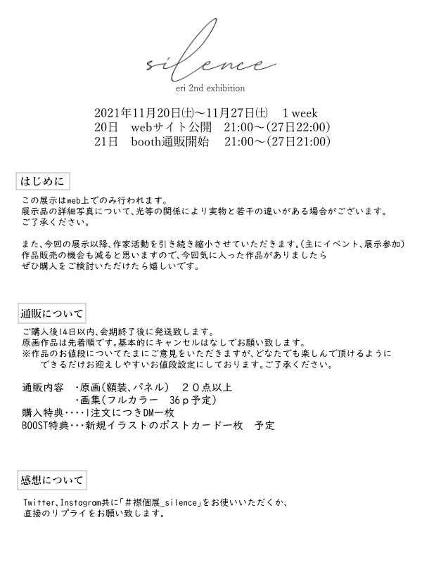 襟web個展「silence」 11/20 21:00 ~ 11/27 22:00 HPの個展ページをご覧ください ★collierek.wixsite.com/collier 通販 11/21 21:00~ ★theaterroom.booth.pm 通販開始までは在庫なしで公開しています #襟個展_silence