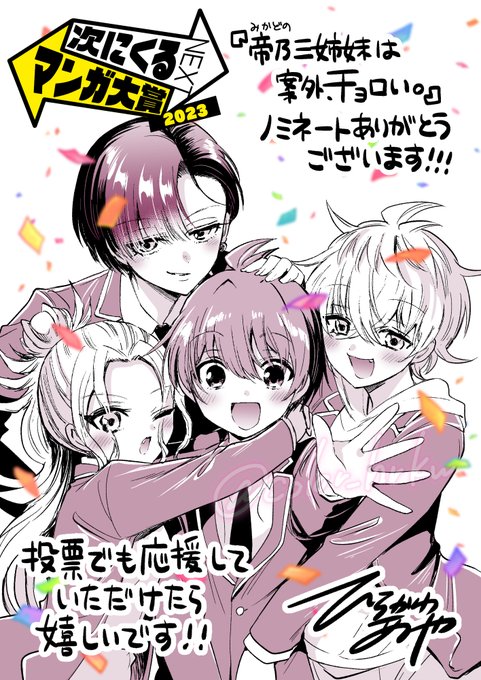 #次にくるマンガ大賞 2023のエントリー期間が終了しました! 『帝乃三姉妹は案外、チョロい。』を推してくださった皆様、本当にありがとうございます!!😌 ノミネートされたら とっても嬉しい~です! これからも作品を盛り上げていけるように頑張ります🙌 #帝乃三姉妹は案外チョロい