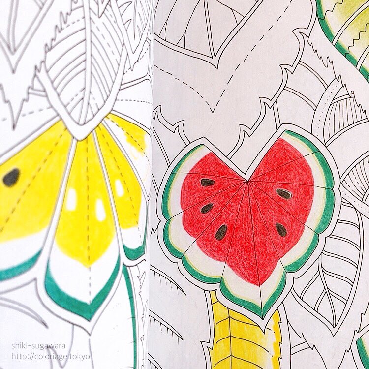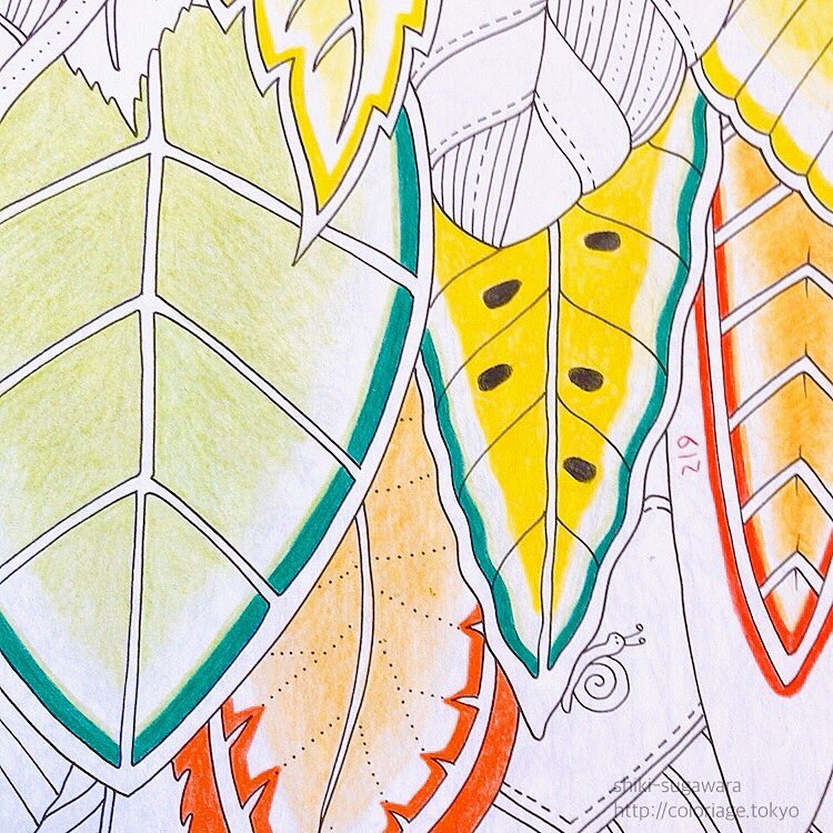昨日に引き続いて、スイカ模様の葉っぱ🍉💛🌿 #大人の塗り絵 #おとなのぬりえ #ふしぎな王国 #コラボ塗り #色鉛筆