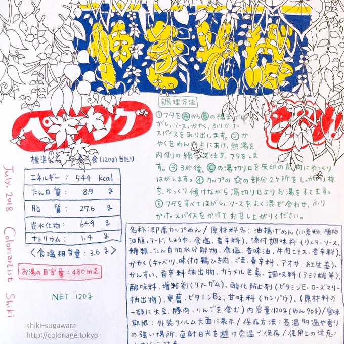 ペヤング焼そばとのコラボ塗り😁 余白を上手く使えたかと思います😆✨ #大人の塗り絵 #おとなのぬりえ #ふしぎな王国 #まるか食品 #色鉛筆