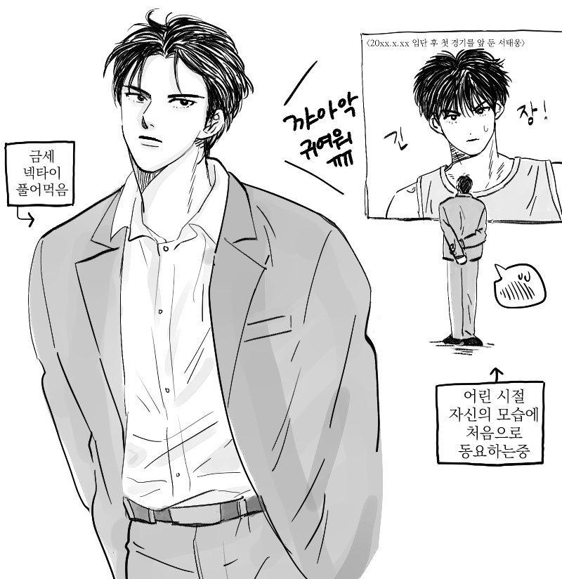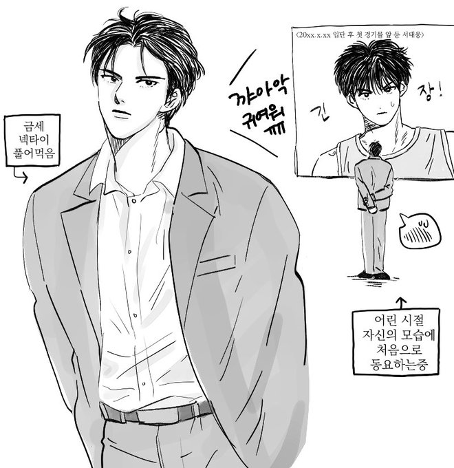 영결식 가는 때웅이 망상..(영9결번식) 무표정이다가 입단 후 첫경기 뛰던 날 자신을 보고 동요하는 때웅이...헤메 받으러가서 졸아서 나중에 전날 잠 설쳐서 그렇다고 해명하는 때웅이...영상편지 모음 받는데 거기 나타난 라이벌팀 주장인 과거 동네 선후배로만 알려진 윤때엽..(센루 트윗입니다)