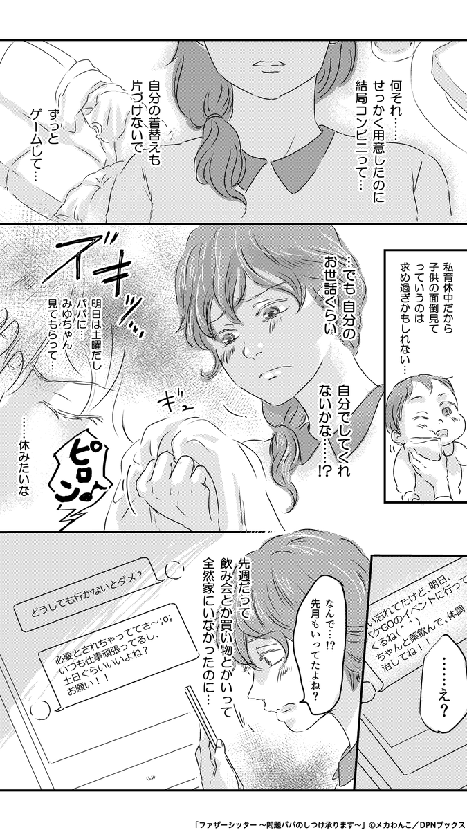 スマホゲーム三昧で何もしない夫。家事と育児で日々疲労困憊の春美は倒れてしまって… 毒舌ベビーシッターの一言が刺さる! (3/3) ↓続きをよむ↓ comic.jp/extra/oc_fater… #漫画が読めるハッシュタグ #コミック.jp