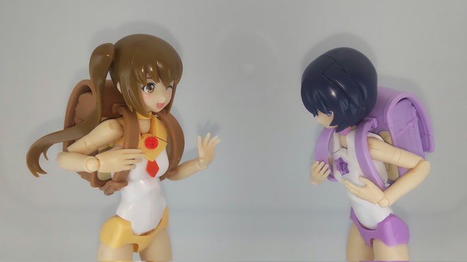 カオプリの二人で背負ってもらったの図 マジガさんも色合いぴったりかなと思います。 ぶっちゃけこのガチャアホみたいに回したのってコレやりたかったからだったりするんですよね。ただ、スクールバッグだらけになるとは思わなかったけど… #メガミデバイス #カプセルトイ #ランドセル
