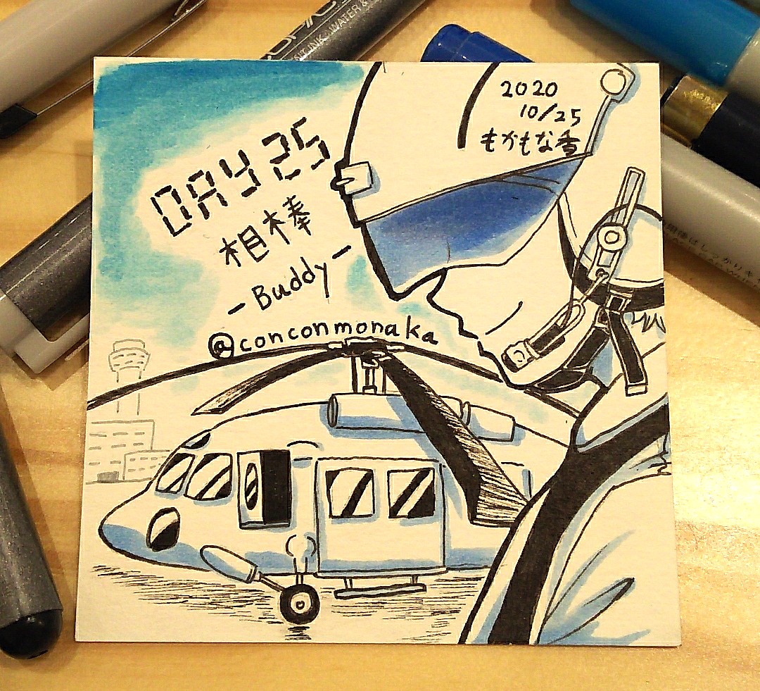 今日はシゲ☆さんとアトリエさんにインクトーバー参加して来ました✨ シゲ☆さんの描いたラテ子ちゃんの作業過程を目の前で拝見できる特等席です👍 私はヘリとパイロットで相棒に参加! #inktober2020 #inktober2020day25 #inktober