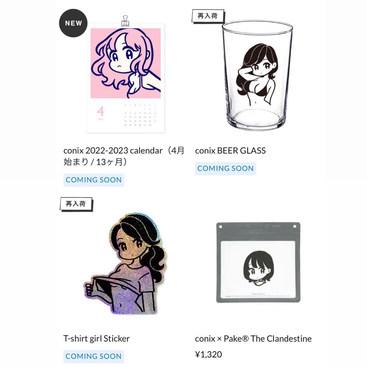 conix 2022-2023 calendar 4月始まりカレンダー、本日19時からconix online storeにて販売します。あわせてBEER GLASS とT-shirt girl Sticker も再入荷します。よろしくお願いします🙇♀️ 今年は販売が遅くなってしまいました、すみません! conix.stores.jp