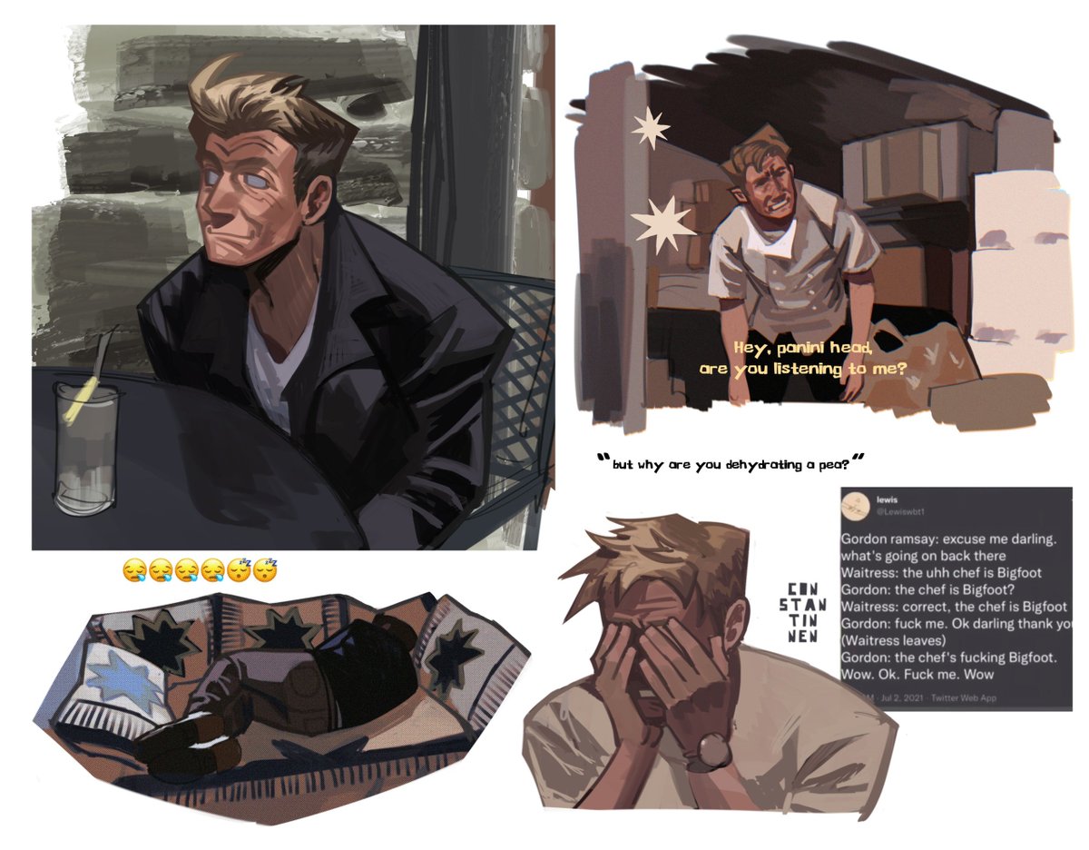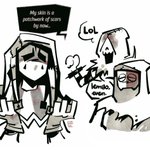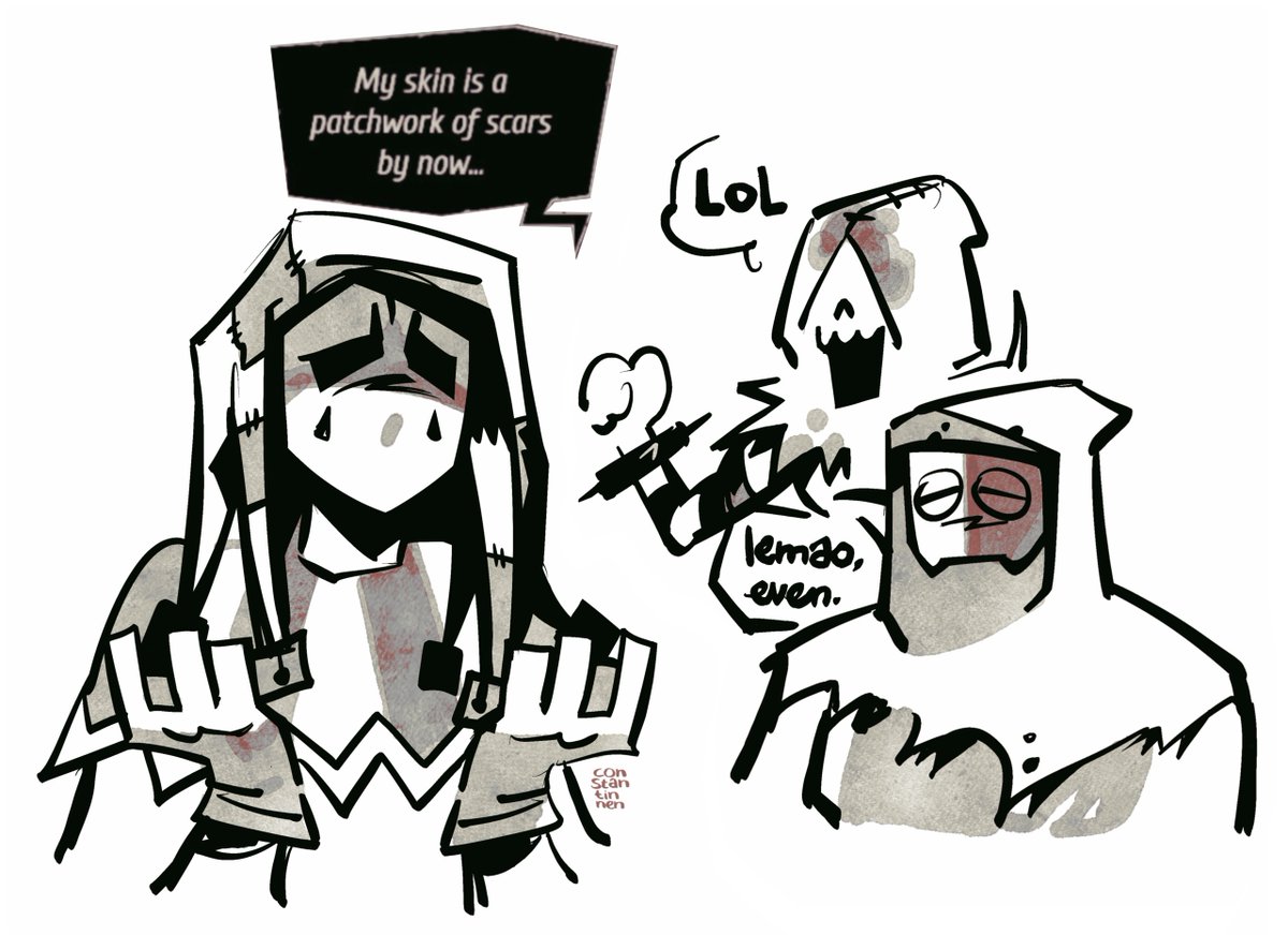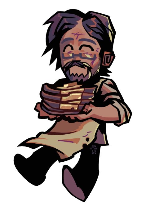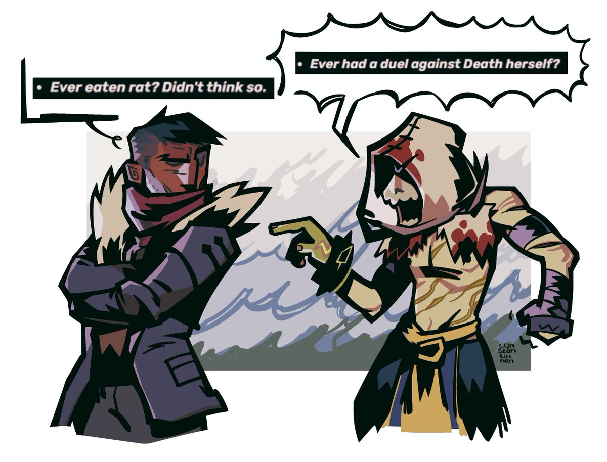 Dismas loves to mention the fact that he ate a rat. darling, no one cares! you collect pancakes from puddles and lick the mold off the floor! it's funny to imagine how the heroes are constantly trying to prove to each other how they "suffered more". #darkestdungeon
