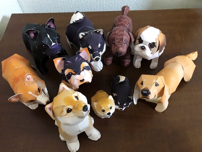 いろんな犬いっぱい作って!って姪っ子からリクエストされたので、いろんな犬いっぱい作ってる。かわいいわー。あと、妹にリクエストされた嘴の長い鳥。 #やりすぎて引かれるタイプ #ペーパークラフト