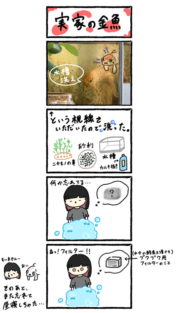 明日フィルター買いに行くから、今晩は仮水槽でお願いします… #4コマ漫画 #漫画が読めるハッシュタグ #絵柄が好みっていう人にフォローされたい