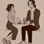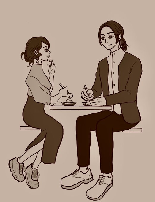#共トワ らくがき スーツじゃない樹神先生と和服じゃない百花さん。スニーカー履かせたかった。 二人が食べてるのはクリームぜんざいです。 オシャレっぽい雰囲気を醸し出していますが、完全にスガキヤにいます。 共感応トワイライト 〜なごや幻影奇想ファイル〜 - カクヨム kakuyomu.jp/works/16816700…