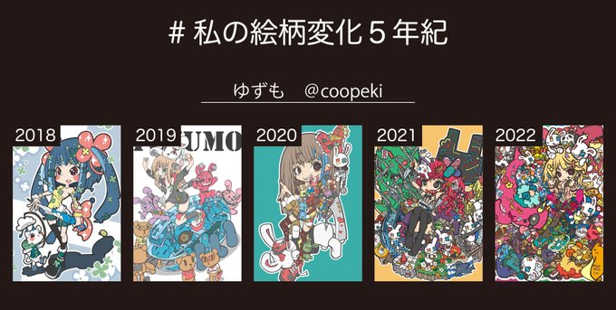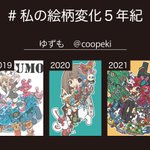 #私の絵柄変化5年紀 テンプレートをお借りしました。 こうやって見ると、少しずつ成長をしているなーっと思うし、どんどん好きな表現ができるようになってる
