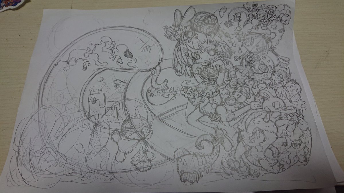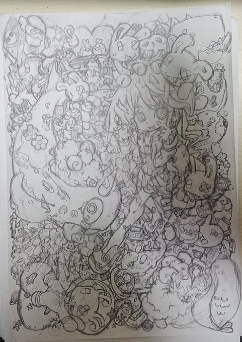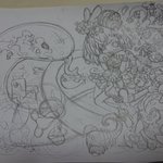 #このタグを見た人はラフ画とその完成絵を見せる ラフから下描き途中のとこと完成 ラフだとぐちゃぐちゃっと、おおまかにどこになにがあるのかを描きます。