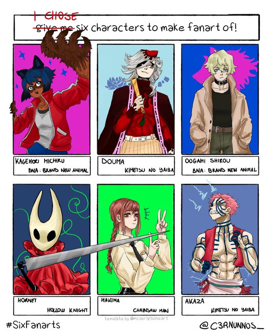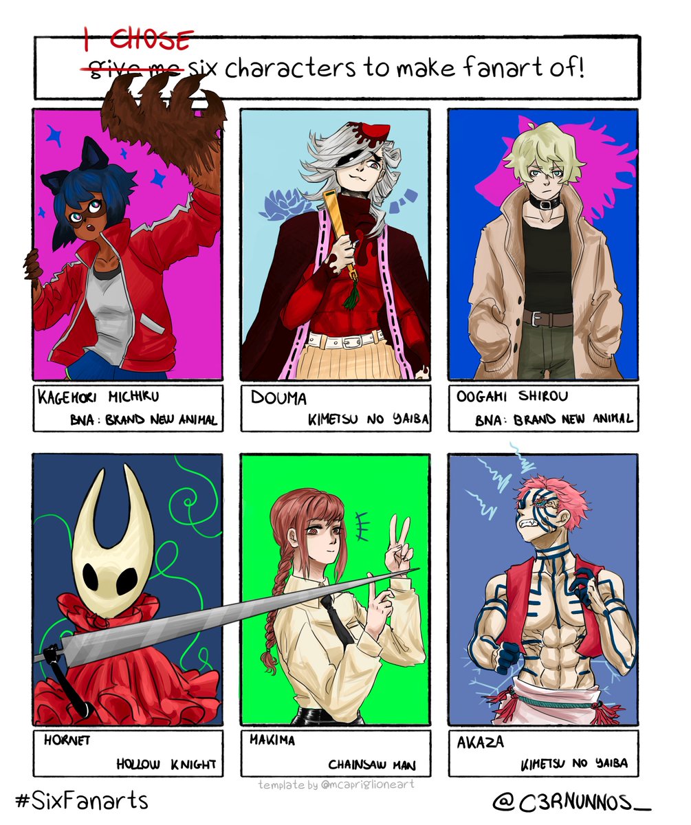 first batch of #SixFanarts done. for now i have two requests, ill wait for four more to upload more. or maybe just choose who to draw again. who knows. #BNA #kimetsunoyaibafanart #hollowknightfanart #chainsawman