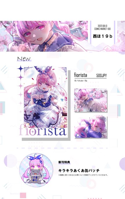 4 7 【C100お品書き】 1日目 土曜日 西ほ19b 夜更かしドール 新刊は湊あくあ多めのホロライブのフルカラーイラスト本です 新刊と特典缶バッチ、色紙持っていきます!!お願いします🙇♂️✨ 22/08/13 07:30