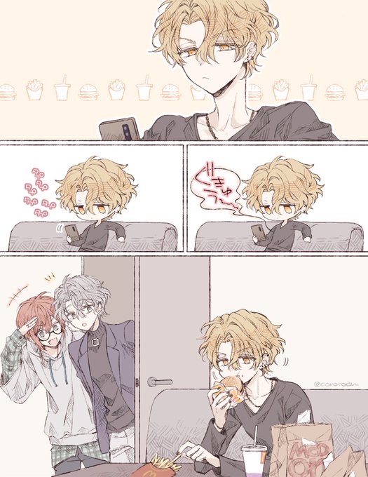 😎「ややッ!?もしやジュダ先生も春🍔🥚🌸実食中ですゥ〜〜〜!?!?✨」 😈「●ンスタ見てくれたのかな?🎶」 昨日の絵の続き(?) そこそこの確率で飯テロに引っかかってはウバる先生