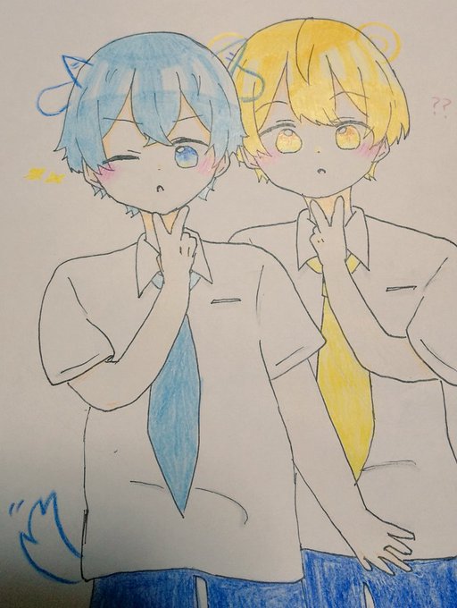 💙「こうやってあごのところにピースしてねっ!」 💛「これであってますか?」 #すとぷりギャラリー #るぅとくん #ころんくん