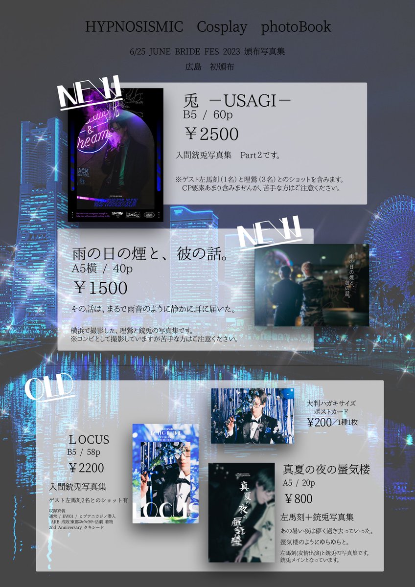 【サークル参加します!】【#広島コミケ250】2023年7月30日(日)広島産業会館youyou.co.jp/allgenre/hiros… 東京&大阪頒布の鍾離、入間銃兎、 理鶯&銃兎の新刊写真集と既刊を携えて、 【C37 】LOCにてお待ちしてます✨ 新しい名刺3種も持って行きます🫶 コスゾーン前!気軽に遊びにきてね〜!🏄♂️
