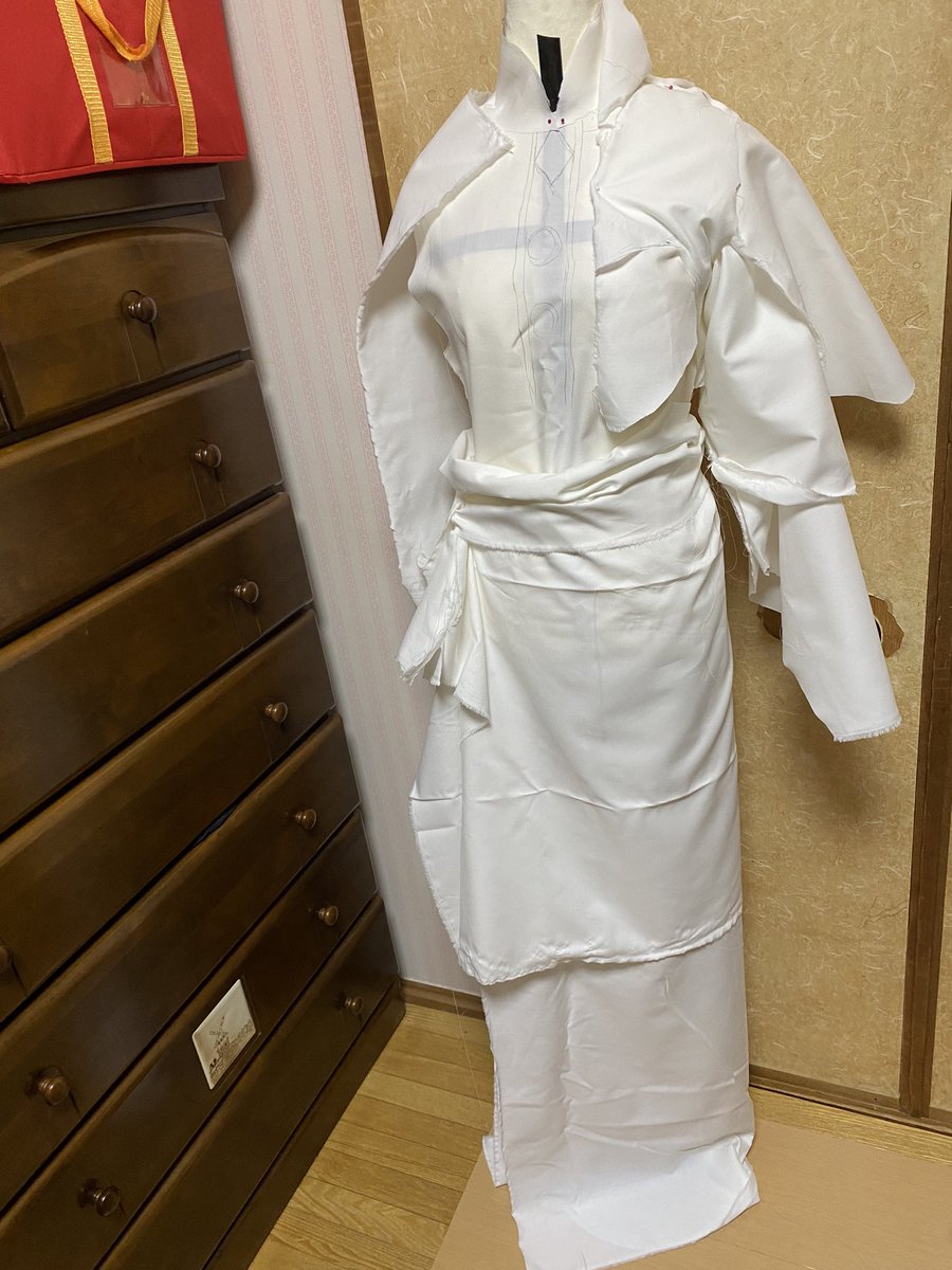 この衣装の制作について語りたいので語りますね☺️ 確かお話が来たのが2月頭らへん?かな?別のもの作ってたので作り始めは3月頭くらい。出来上がったのが6月中旬なのでやってない期間もあるけど3ヶ月くらい。まずはこんな感じでマジでザックリとりあえずどんな形かを知る為に作る。 twitter.com/cos_sakurano/s…