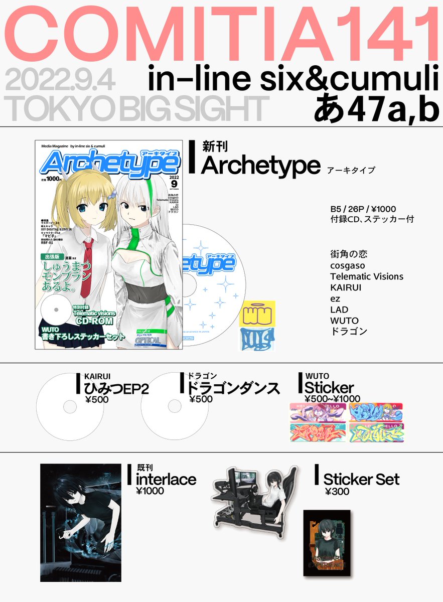 16 75 【お知らせ】 #COMITIA141 『Archetype』 通販開始しました、よろしくお願いします。 ↓booth↓ cosgaso.booth.pm/items/4146729 22/09/06 20:00