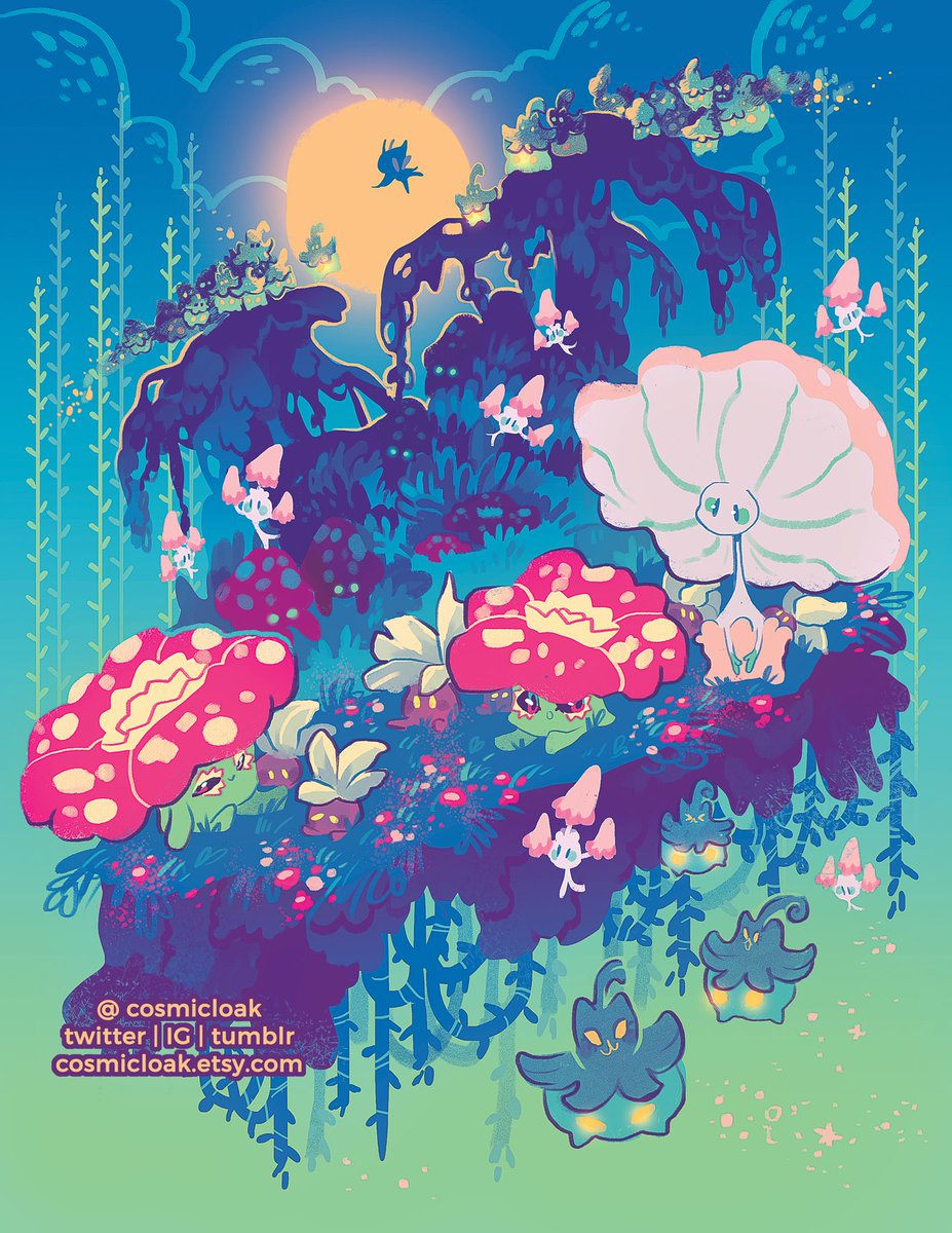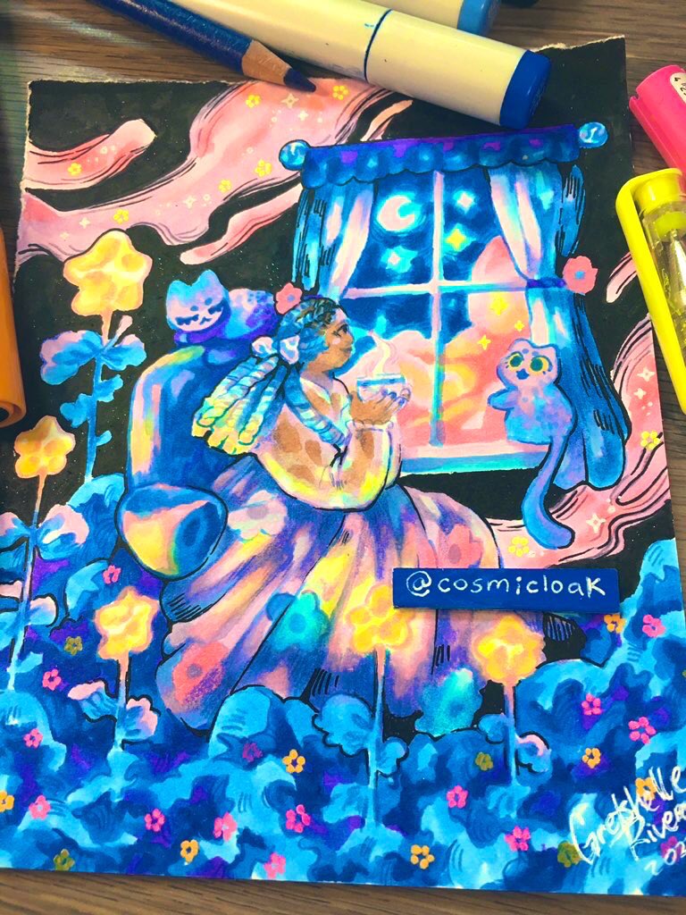 happy #juneteenth mixed afrolatine (puerto rican) queer illustrator🫧 love dreamy colors/surreal moods- love cats, plants, pokemon, retro anime & psych horror elements🌷 more art: cosmicloak.carrd.co sh0p: cosmicloak.bigcartel.com seeking art agent / open to paid projects