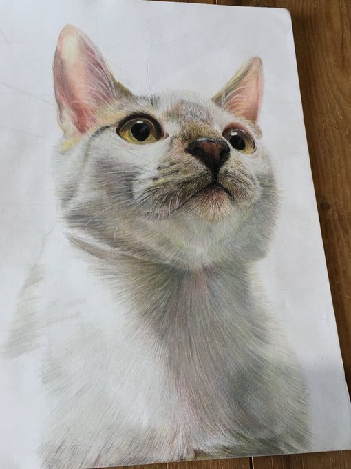 1 14 これは猫の写真をiPhone画面で見ながら色鉛筆で描いたそうな。と、いうか高1にしてはうますぎる。流石。こないだまで中3。ウチで教えたのは、色鉛筆の抽象画と、色鉛筆で絵画(コピー用紙の)模写のみ。超写実画は教えてない。 #色鉛筆画 20/12/13 23:27