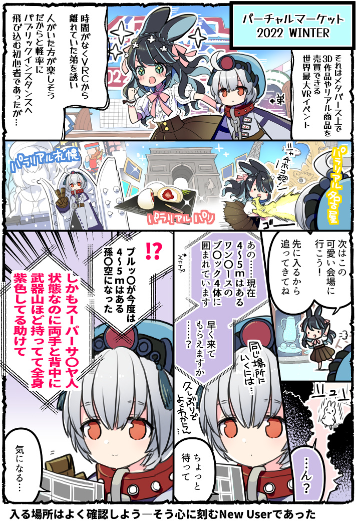 567 2254 誰もいない深夜のチュートリアルワールド……そこで出会ったのは凄く小さなたれ耳うさぎの女の子であった。 今の私ならアバター名も勿論わかる……あの時のうささきさん、丁寧に案内して下さりまことにありがとうございました……! #VRC漫画 #VRChat 23/04/12 18:01
