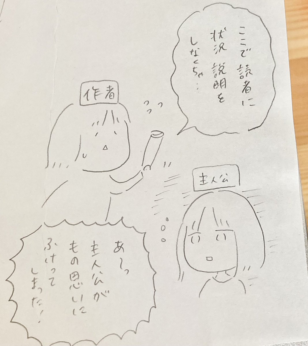 2 31 ネーム中のらくがき。ストーリーを作るときは頭の中で作者と主人公の二つの視点を同時に走らせるんですが、いつもこうなる 22/04/02 14:39
