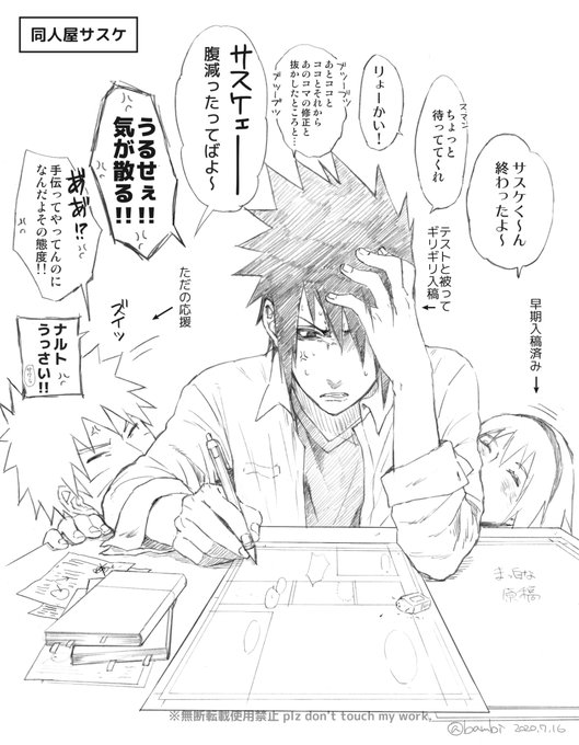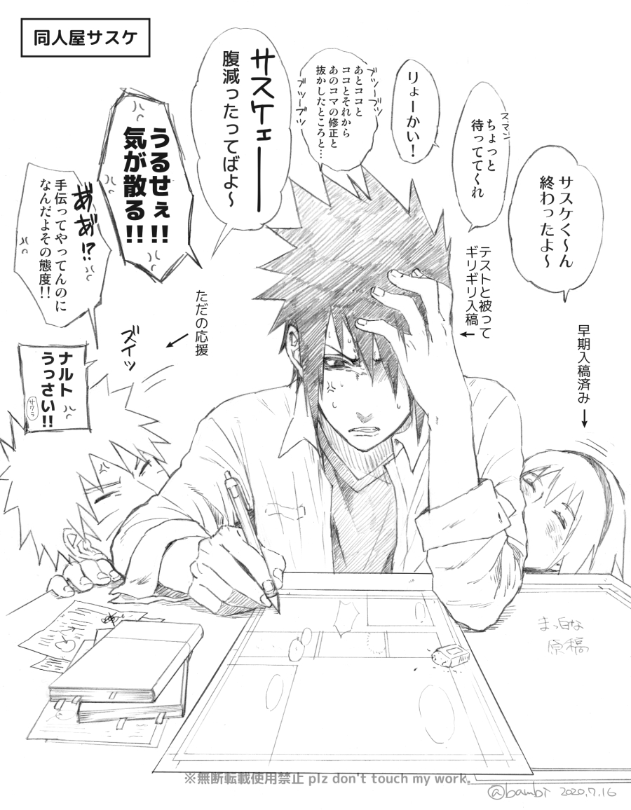 49 339 現パロ同人やってる7班~同人屋サスケ~ 机片付けてたらアナログの落書き出てきたので取り込んで少し修正しました。多分2年?くらい前に描いたやつ…?デッサンがアレすぎるけどまあ楽しく描いた記憶あるので上げます。 20/07/16 21:14