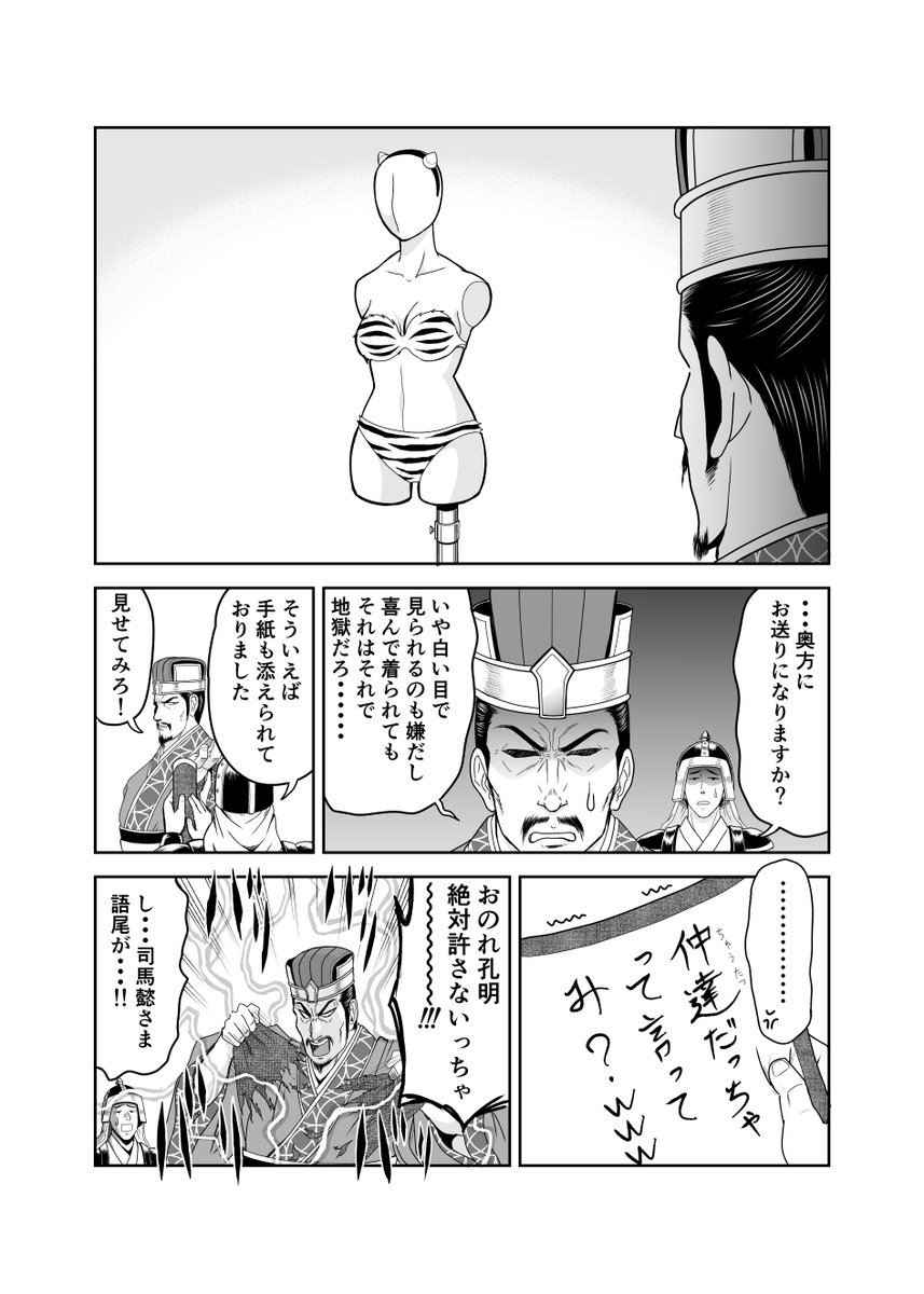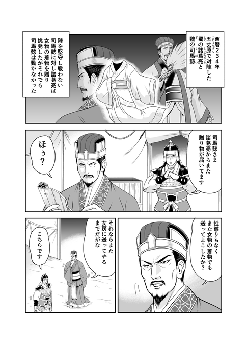 プレゼント フロム 孔明(別オチバージョン)。 コーンに比べると捻りがない分わかりやすい……かも知れない。 #三国志 #司馬懿 #諸葛亮 #漫画が読めるハッシュタグ