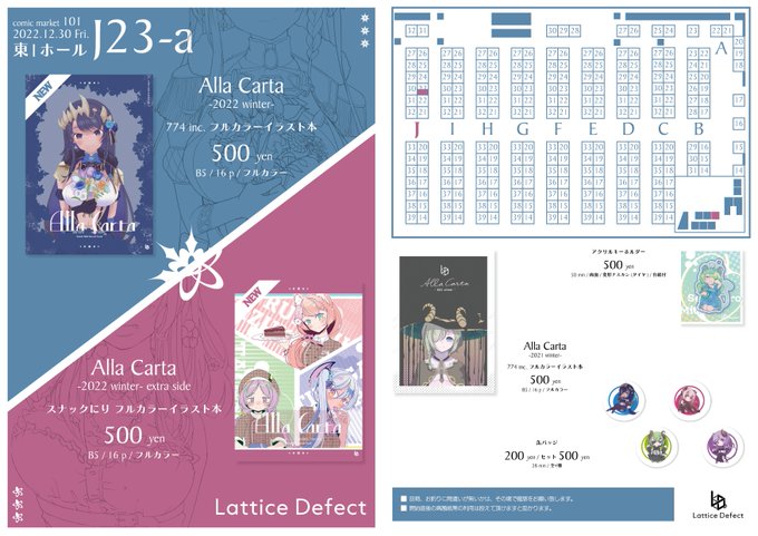 あなたのサークル「lattice defect」は、コミックマーケット101で「金曜日東地区 "J " 23a」に配置されました!コミケWebカタログにてスペース配置場所公開中です! webcatalog.circle.ms/Circle/Map/168… #C101WebCatalog